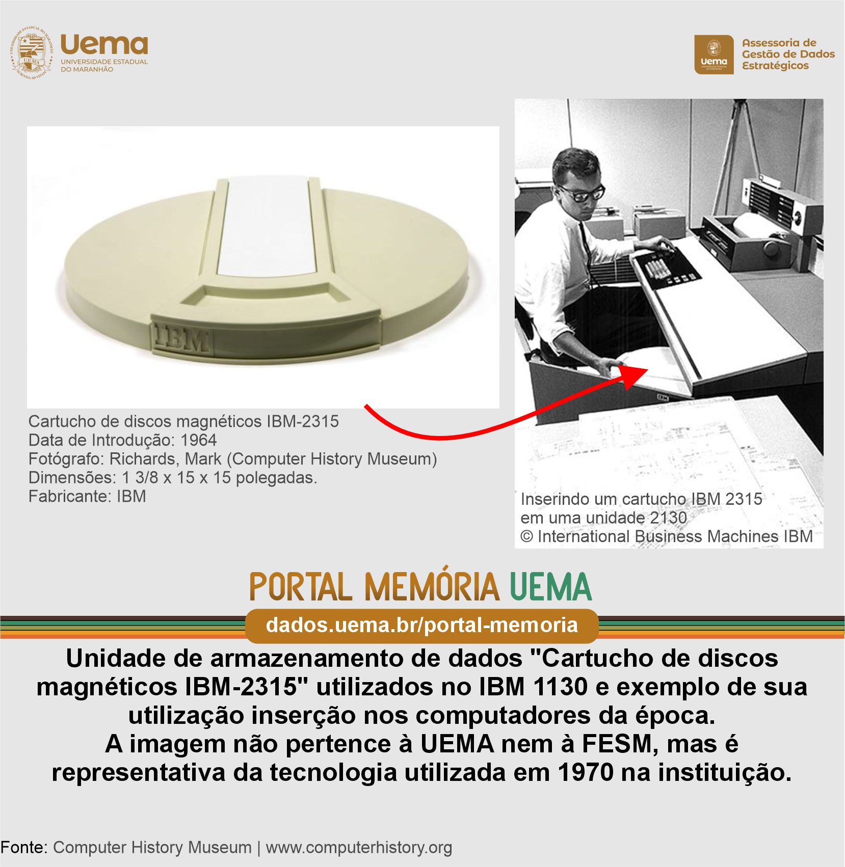 ● Cartucho de discos magnéticos IBM-2315, lançado em 1960, com capacidade de aproximadamente 1 megabyte (1.024.000 bytes), segundo o Computer History Museum (computerhistory.org).